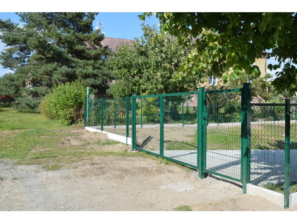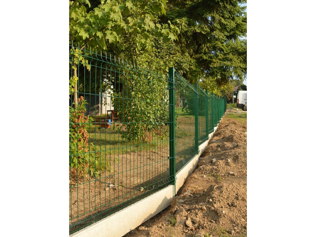3D plotové panely zelené barvy, plotové sloupky profilu JEKL, "U" příchytky plotových panelů a podhrabové betonové desky.