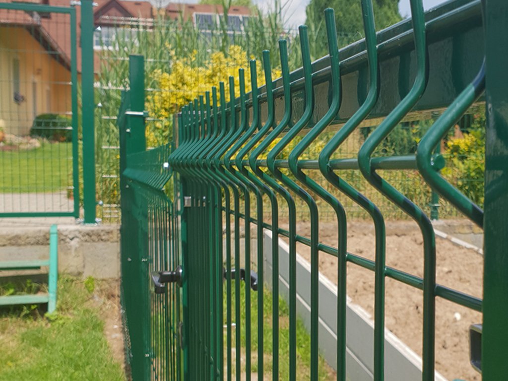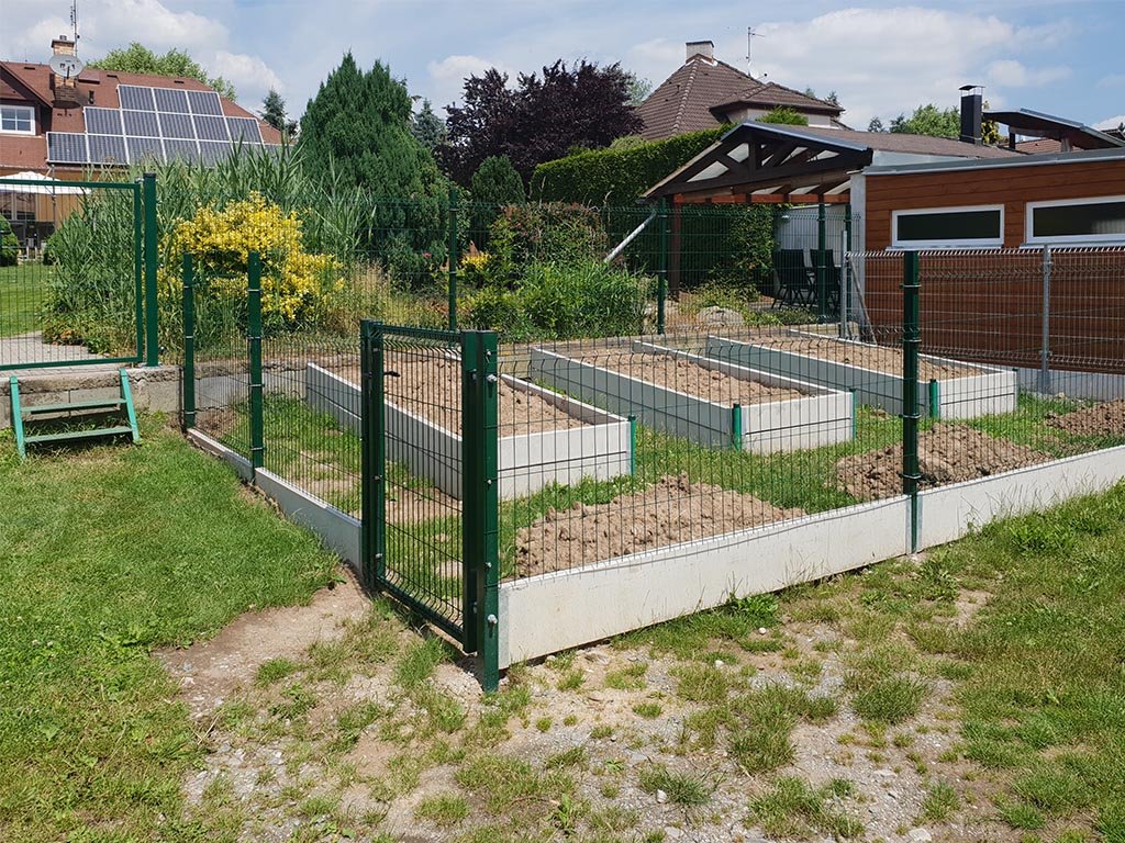 Plotový panel 3D v zelené barvě - výška 140 cm s drátem o průměru 5 mm a 122 cm s drátem 4 mm, branka 122x100 cm a branka 140x100 cm na patkách (atypická výroba), dále jeklové sloupky 60x40 mm a podhrabové betonové desky