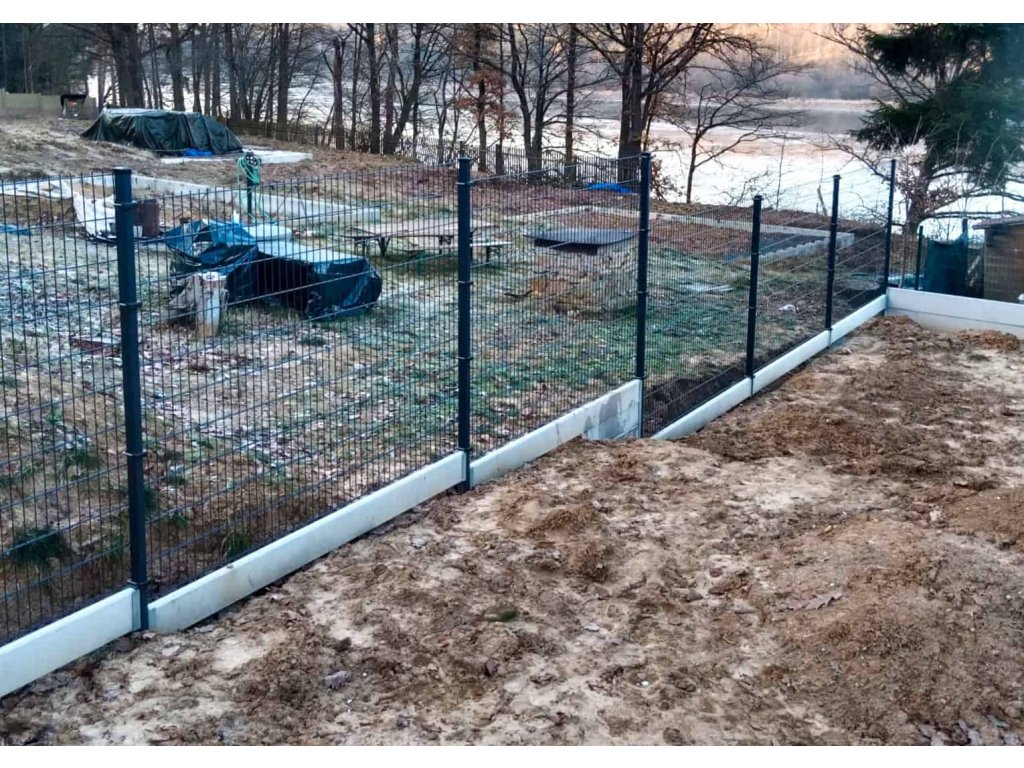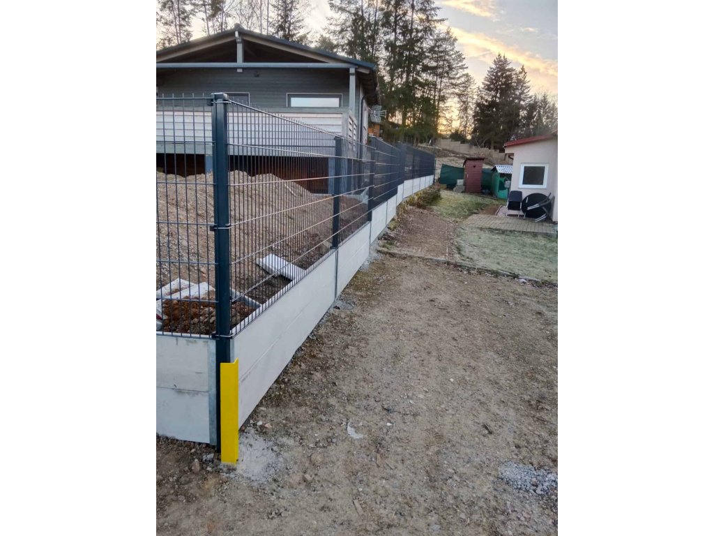 Na Hracholuskách jsme montovali antracitové 2D plotové panely s podhrabovými deskami. Kvůli složitému terénu byly na některých místech použity dvě podhrabové desky nad sebou. Zahrada ještě bude procházet stavebními úpravami a dorovnáním terénu.