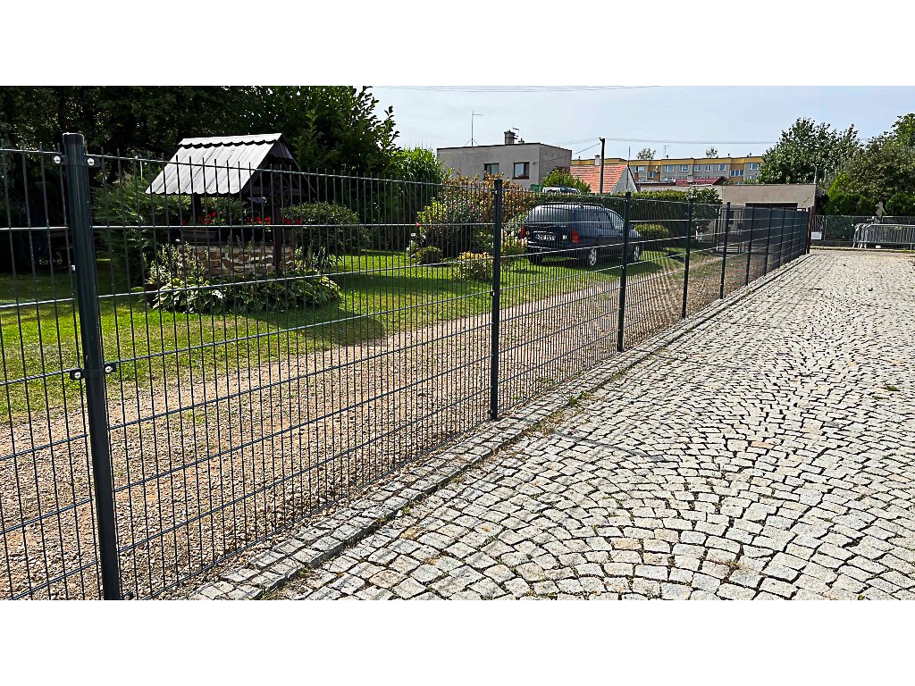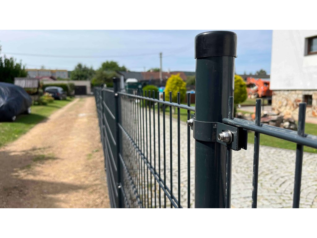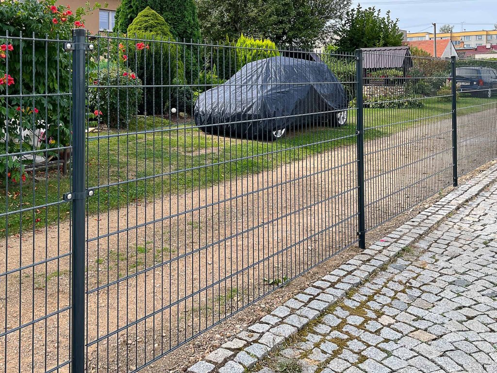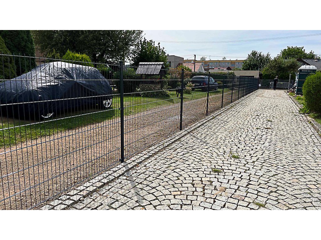 V Rokycanech jsme montovali plot z antracitových 2D plotových panelů. Na části oplocení byl pro větší soukromí postaven betonový plot.