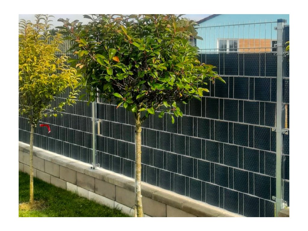 Montovali jsme plot z 2D plotových panelů na podezdívce, který bude doplněný výplní z ratanových pásů pro zastínění.