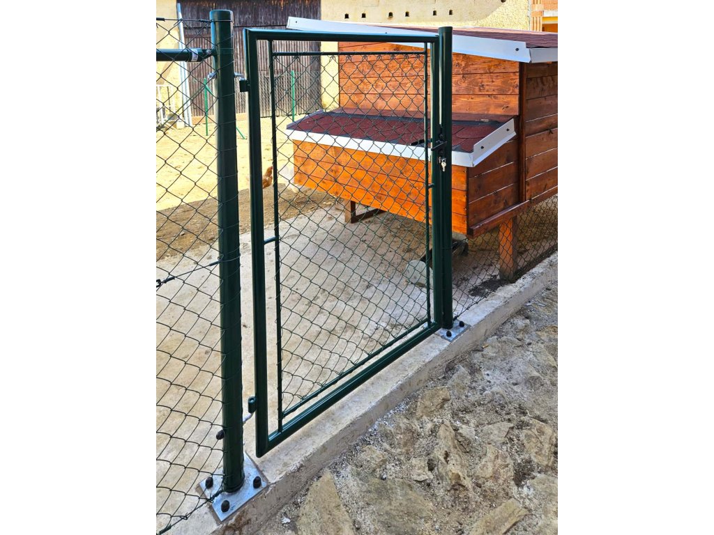 Čtyřhranné pletivo, sloupky, vázací drát, napínací drát, patky na sloupky, branka.