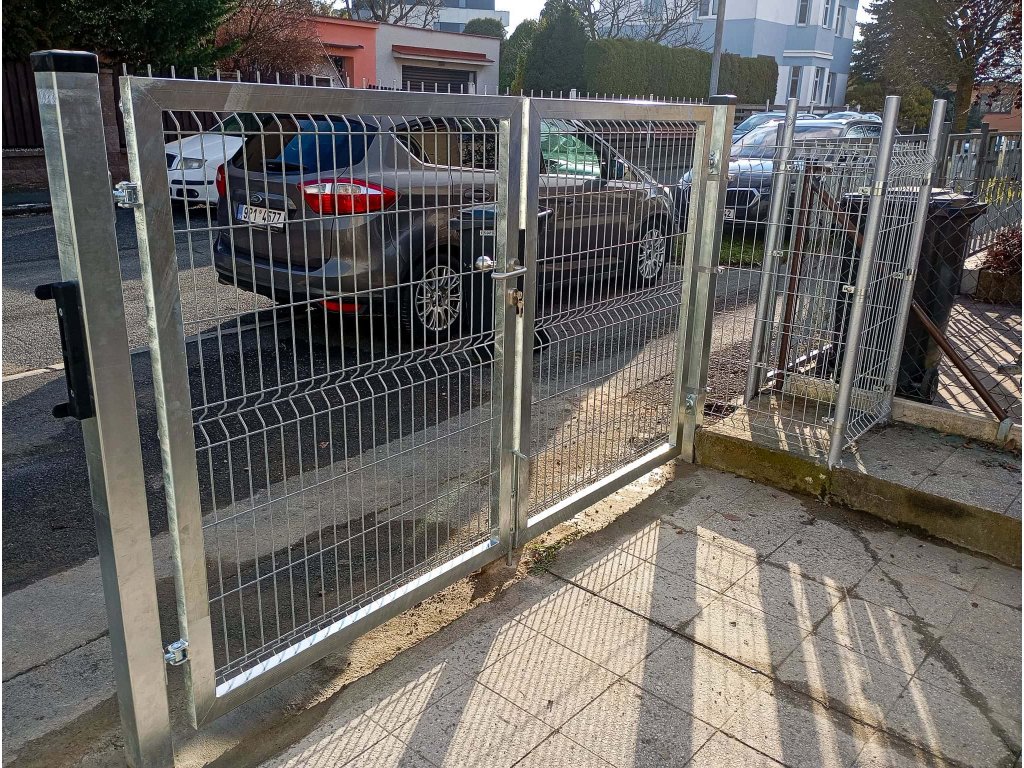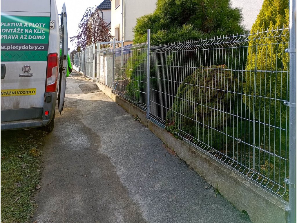 V Plzni jsme montovali plot z 3D plotových panelů, které jsme ukotvili na původní sloupky. K oplocení jsme na míru zhotovili dvoukřídlou bránu a jednokřídlou branku atypických rozměrů.