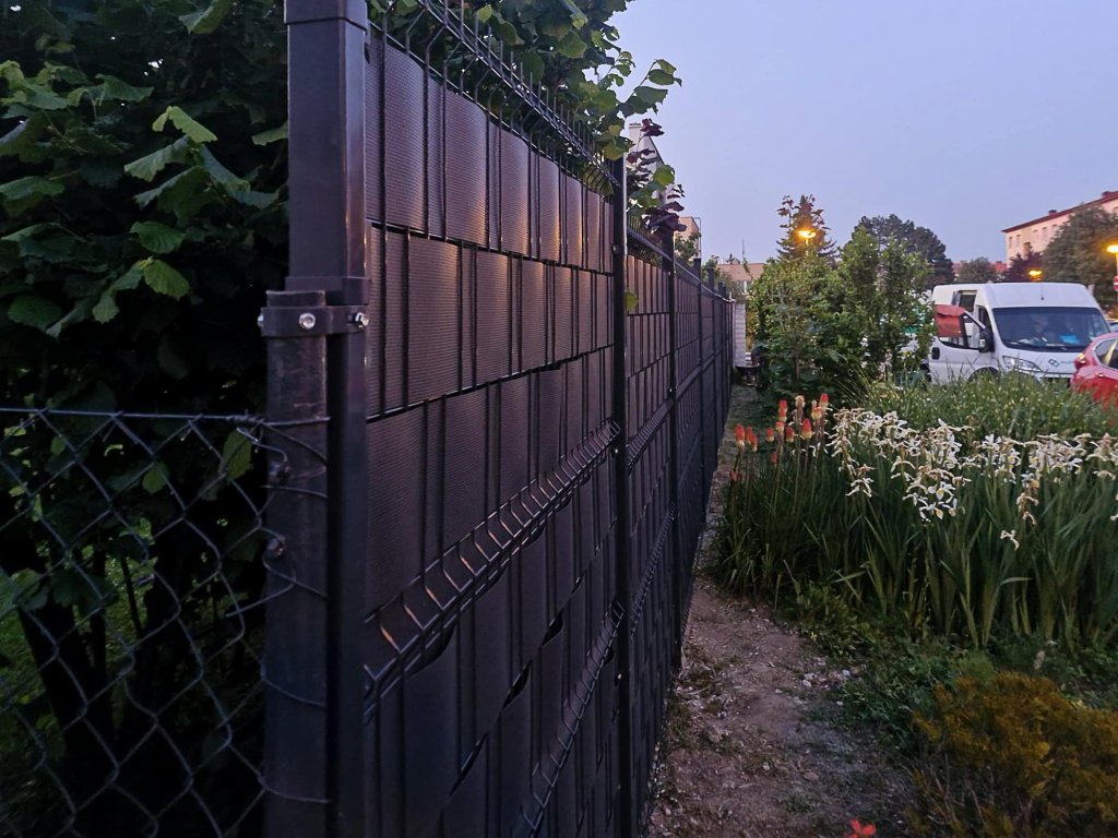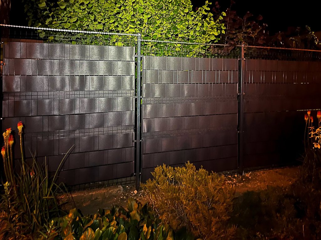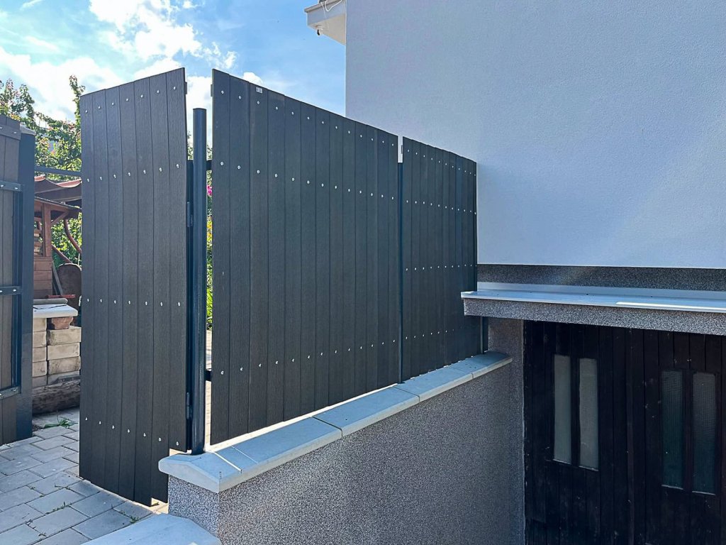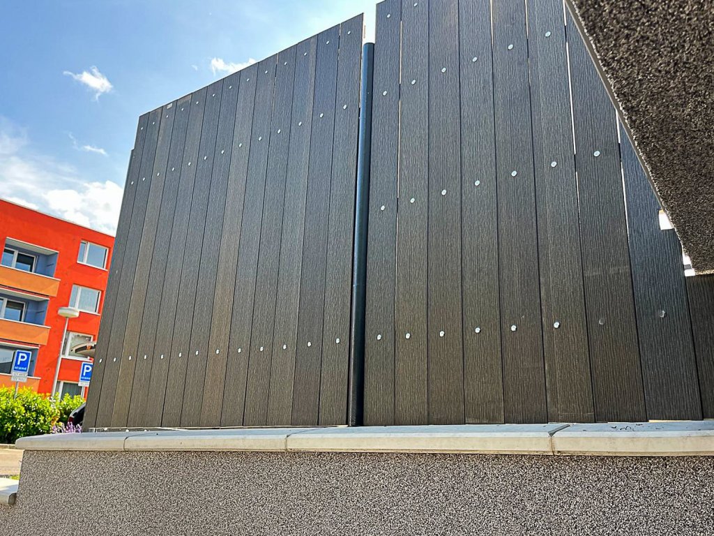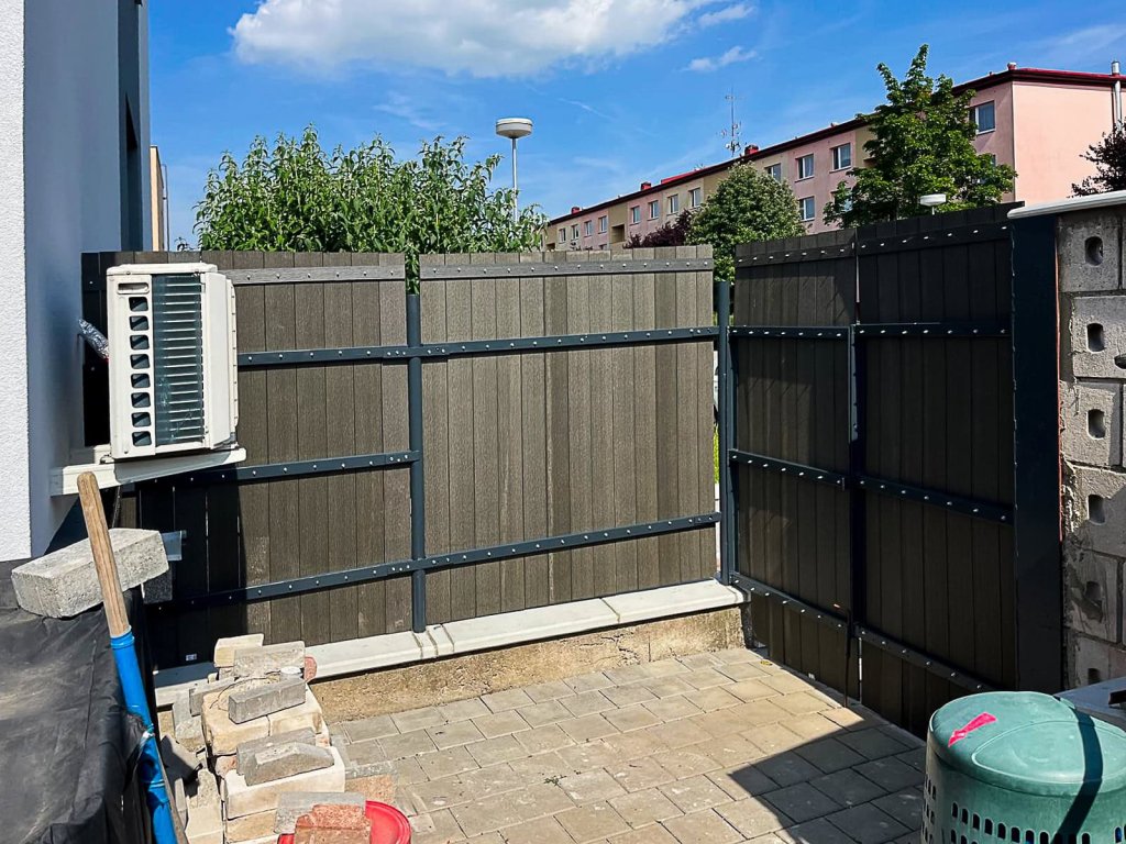 V Kroměříži jsme montovali plot z 3D plotových panelů vyplněných stínícími pásy. Ve vrchní části plotu byla pro větší zabezpečení použita žiletková páska. Na části pozemku byl pak plot postaven z antracitových WPC plotovek.