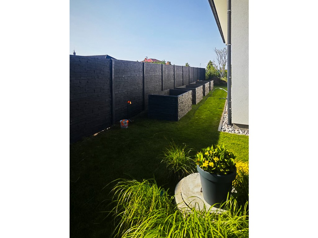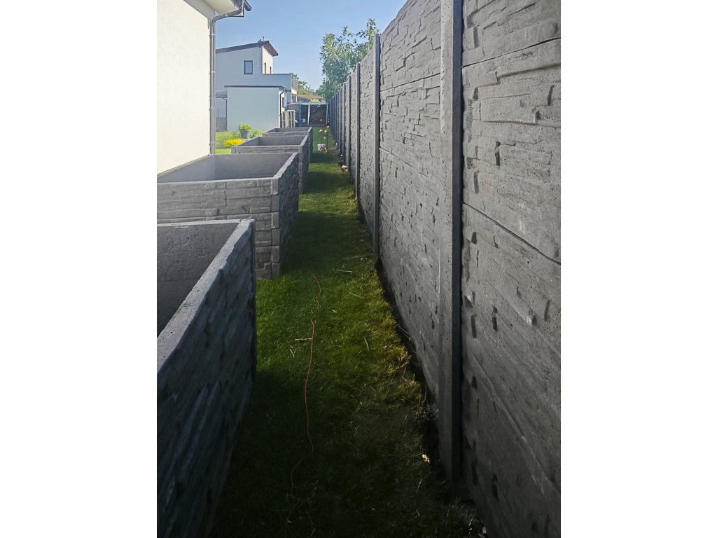 V Praze jsme montovali plot z betonových desek v barvě grafit. Ze stejně barevných betonových desek jsme na pozemku namontovali i vyvýšené záhony.