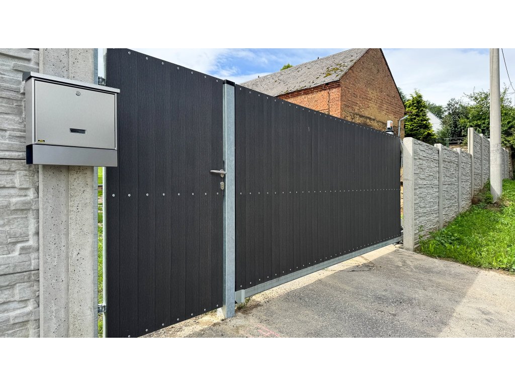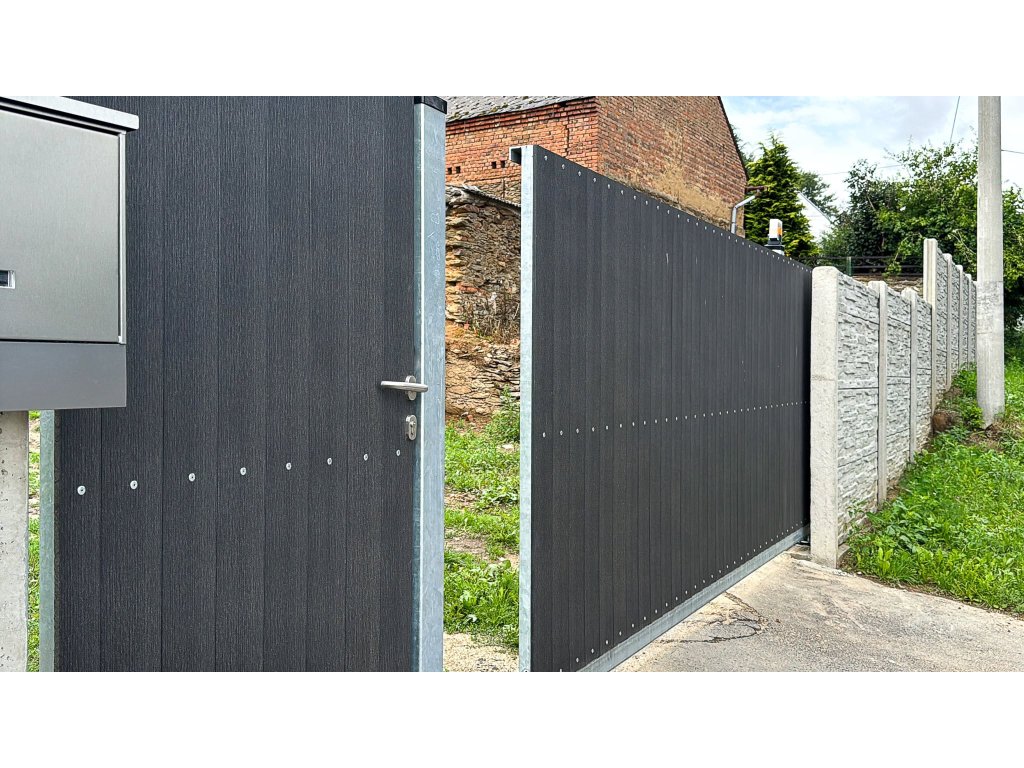 U Toužimi jsme montovali plot z betonových desek. K plotu jsme na míru zhotovili branku a posuvnou bránu s výplní WPC plotovek.