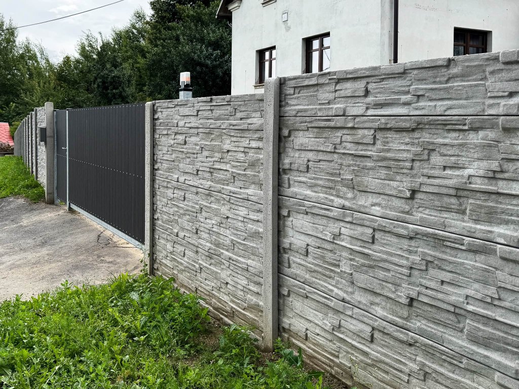 Realizace – betonový plot a posuvná brána s výplní WPC plotovek | Toužim
