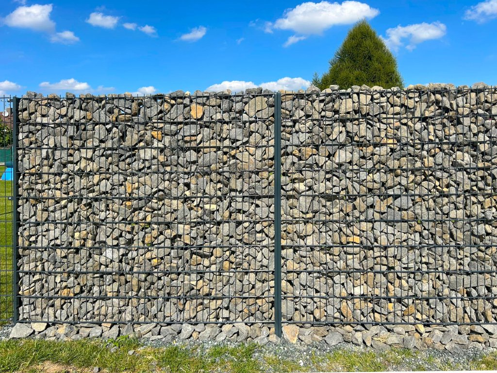V Liberci jsme montovali plot z 2D plotových panelů. Na částech plotu byly 2D panely využity místo gabionových stěn a následně vysypány kamenivem.