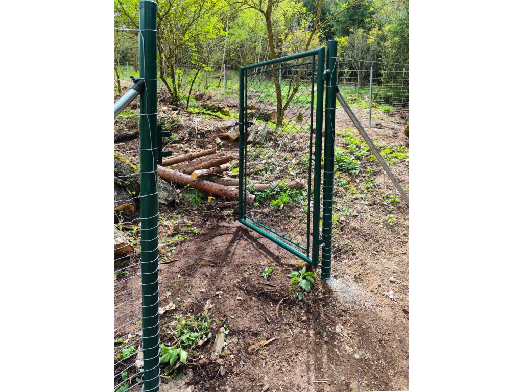 Lesnické pletivo, sloupky, vzpěry, příchytky na napínací drát, vázací drát, branka.