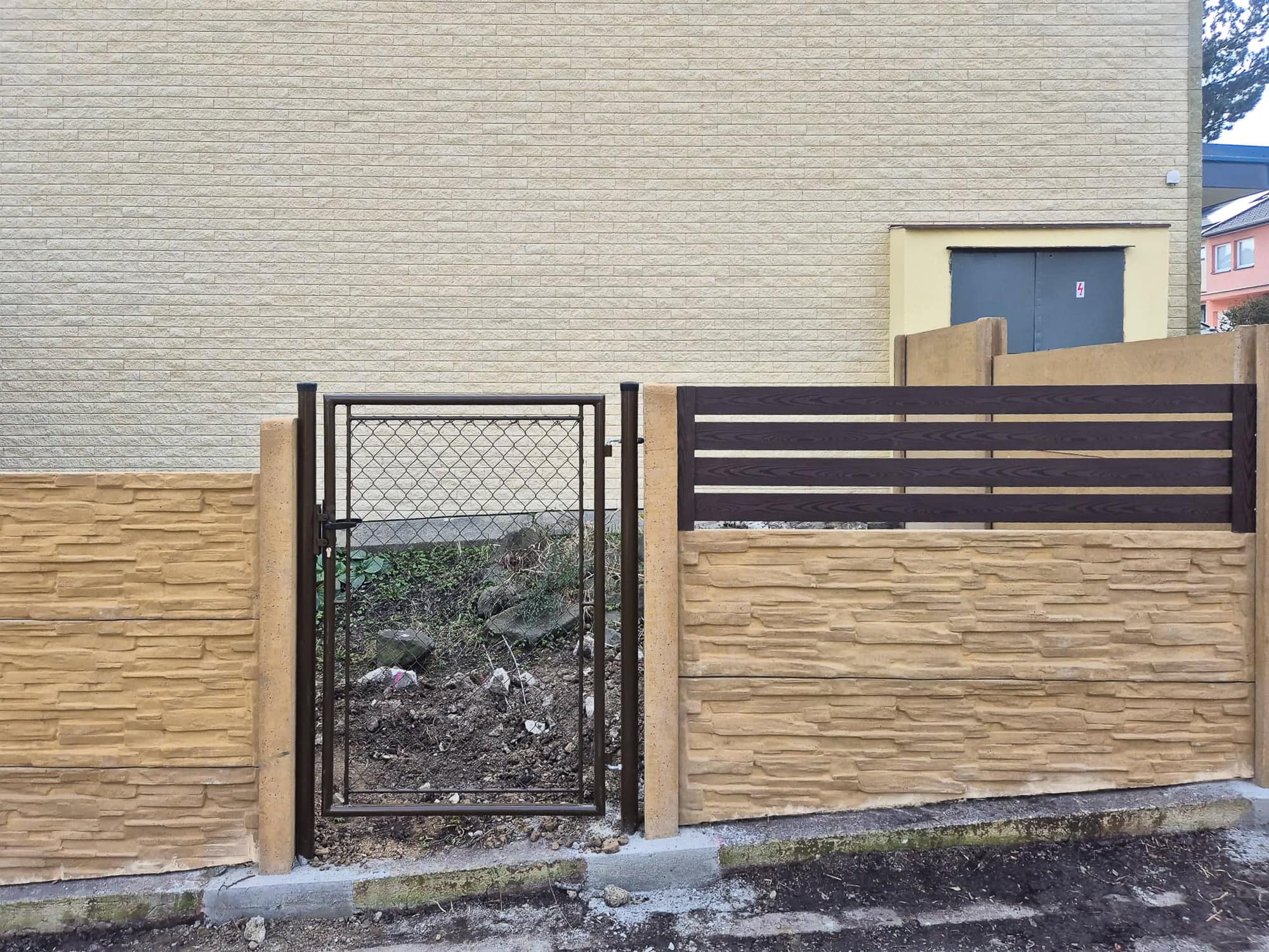 V Děčíně jsme montovali plot z betonových desek v barvě pískovec. V horní části plotu jsme použili plotovky Pilwood-Sand. Součástí plotu je také branka s výplní čtyřhranného pletiva.