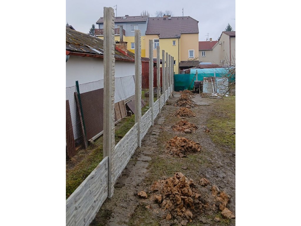 Betonové desky, atypické betonové sloupky pro výšku plotu 2,5 m.