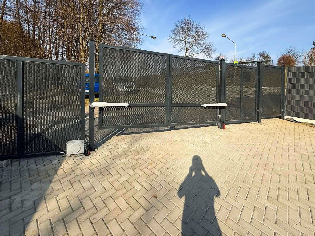 U Nového Jičína jsme montovali plot z 2D plotových panelů vyplněný stínícími pásy. K plotu jsme na míru zhotovili branku a bránu s výplní tahokov. K dvoukřídlé bráně jsme následně domontovali pohon.