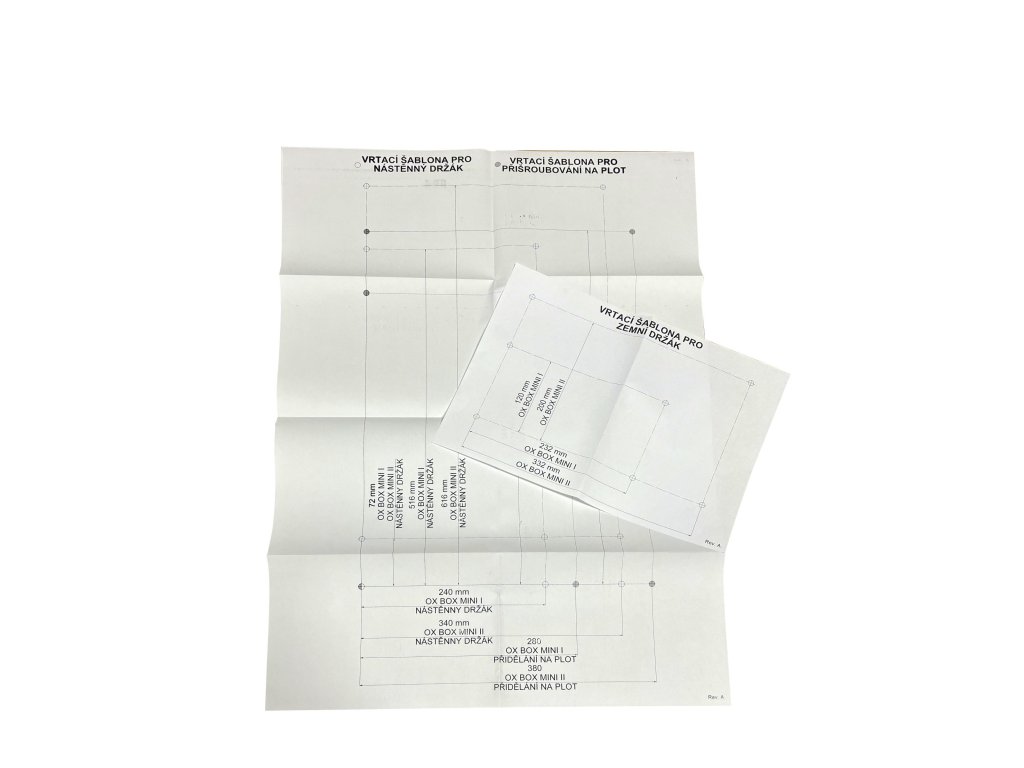 - Výkresy/plány pro montáž na stěnu/na plot/na zem – není potřeba nic složitě vyměřovat, šablona vám ukáže, jak a kde vyvrtat přesné díry do zdi/do země